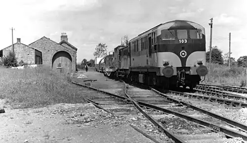 ![]() Train in Kingscourt station (1976). Goods shed to the left, former passenger building behind it | |||||||||||