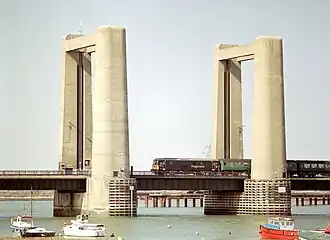 In 1860, the first bridge on the site was completed. It was a bascule bridge, built to carry railway traffic across The Swale between the Isle of Sheppey and mainland Kent for the London, Chatham & Dover Railway Company to the port of Sheerness. There was also provision for road traffic over a single lane, controlled by traffic lights.[1] The LCDR and the South Eastern Railway (SER) amalgamated to form the South Eastern & Chatham Railway which replaced major elements of the bridge and during 1904, a replacement Scherzer-type moving section was installed.[2] [3]