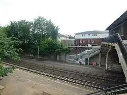 ![]() Kingsland station facing northbound (towards Suffern) on the Hoboken-bound platform, with the station depot and Route 17 crossing overhead. | |||||||||||||||||||||