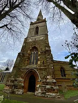 The west tower and recessed spire are 14th-[25] or 15th-century.[23] The tower has a ring of six bells. Robert Atton of Buckingham cast the second bell in 1621 and the fifth bell in 1622. Henry I Bagley of Chacombe cast the tenor bell in 1671 and Henry II Bagley cast the third bell in 1680. Alfred Bowell of Ipswich, Suffolk cast the treble and fourth bells in 1911.[26]
