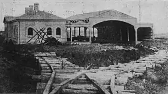 ![]() Invercargill railway station in the 1860s with the wooden rails used on the line to Makarewa until 1867 | |