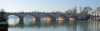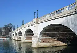 Leland refers to a contemporary bridge and to an older wooden bridge that had existed at Kingston since the 13th century. This was about 100 feet downstream of the present bridge: Old Bridge Street at Hampton Wick used to be matched by an Old Bridge Street on the Kingston side.[5] In 1318 the bridge was described as being in a dangerous condition.[6] The successive bridges contributed greatly to Kingston's success as a medieval market town.