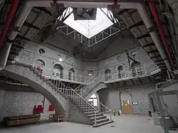The institution was built on land described as "lot number twenty, in the first concession of the Township of Kingston". The cells originally measured 73.7 cm (29.0 in) wide by244 cm (8.01 ft) deep and 200.7 centimetres (6 feet 7.0 inches) high. The area had a 12-foot high wooden picket fence. In 1845, towers, stock walls, and the north gate house were completed. From 1859 through 1861 a dome was added connecting four cellblocks.[1]