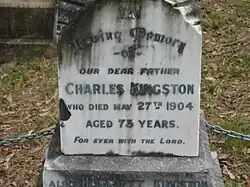 In 1888, Charles and his wife Harriett returned to visit England, and on their return made plans to build a new house, much grander than the first. The new home was built in 1890, on a hill which overlooked the railway station. Kingston House became a landmark for the district and is heritage-listed today. Their home (now at 5 Collin Court) could be seen from many points around Kingston, and the large ballroom in Kingston House was the centre of social life in the district. Charles Kingston died in 1904, three months after he and Harriett celebrated their 50th wedding anniversary. Harriett Kingston died in 1911. Both are buried at the Kingston Pioneer cemetery.[1][2][3]