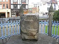 The first surviving record of Kingston is from AD 838 as the site of a meeting between King Egbert of Wessex and Ceolnoth, Archbishop of Canterbury.[12] Kingston lay on the boundary between the ancient kingdoms of Wessex and Mercia, until in the early tenth century when King Æthelstan united both to create the kingdom of England. According to the Anglo-Saxon Chronicle, two tenth-century kings were consecrated in Kingston: Æthelstan (925), and Æthelred the Unready (978). There are certain other kings who are said to have been crowned there, but for whom the evidence (including the writings of Florence of Worcester and Ralph de Diceto) is less substantial: Edward the Elder (902), Edmund I (939), Eadred (946), Eadwig (956), Edgar the Peaceful (c. 960) and Edward the Martyr (975). It was later thought that the coronations were conducted in the chapel of St Mary, which collapsed in 1730. Tradition dating to the 18th century holds that a large stone recovered from the ruins played a part in the coronations. It was initially used as a mounting block, but in 1850 it was moved to a more dignified place in the market before finally being moved to its current location in the grounds of the Guildhall.[13][14][15][16]