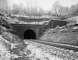 ![]() The east portal of the 1911 Kingwood Tunnel, with the closed-up 1858 portal visible at above right | |