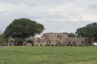 The main house is a rambling, mostly one-story structure with the main public rooms laid out in line, starting at the south end with service areas, the kitchen and the pantry. The dining room adjoins the kitchen, with a projecting round breakfast room on the east side, then an entry room with a fireplace and a living room with a fireplace. An office is located above the entry room, reached by an exterior stairway. A bedroom wing is appended to the north side of the living room, extending to the east with a guest bedroom and master bedroom and attendant bathrooms and closets, both with rounded projecting bays. The guest house features a "kiva room," circular in shape and resembling a Native American kiva, then an entry, a living room, a small kitchen and a bedroom and bath. The foreman's house is roughly square in arrangement, with living room, dining room, kitchen and three bedrooms, and porches on three sides. Exterior walls are rounded adobe with irregular parapets and projecting vigas.[2]