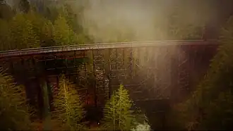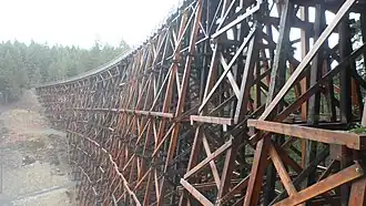 The bridge's dimensions measure 44 m (144 ft) high and 188 m (617 ft) long, making it the largest wooden trestle in the Commonwealth of Nations and one of the highest railway trestles in the world.[2] It was constructed out of old-growth Douglas fir timbers,[3] and has an unusual seven-degree curve.[4]