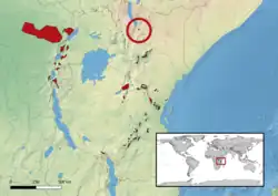 Kinyongia (derived from the group's name in Kiswahili language) is a genus of chameleons found in montane and sub-montane areas in Kenya, Tanzania, Uganda, Rwanda, Burundi, and far eastern DR Congo. They are restricted to forests, woodlands and other wooded habitats, and many species have very small geographic ranges. In most species, at least the males have horns or knobs on their noses.[1][2] As typical of most chameleons, Kinyongia are oviparous.[3]