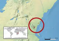 This species has been recorded in Tanzania's Afrotemperate forests in east Usambara Mountains and Magrotto Hill. In Kenya, it is only known as a subpopulation in the Shimba Hills. The populations in the two countries are clearly separated and it remains to be verified if they belong to a single species or two separate species.[1]