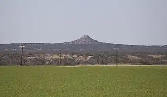 Kiowa Peak is an erosional remnant located in heavily dissected terrain at the western edge of the Brazos River valley.[3] The soils of the area are shallow clay and sandy loams that support mesquite, yucca, cacti, and sparse grasses.[4] Most of the soils in this region formed in unconsolidated, red, slightly calcareous sediments of Permian age.[5] The local terrain is sparsely populated rangeland, cut by highly intermittent streams such as the Salt Fork Brazos River, North Croton Creek, Wedington Creek and other minor tributaries of the Brazos River. The erosionally resistant sandstones of the peak's cap have protected underlying sediments that have remained intact, while surrounding sediments have eroded away. As a result of this process, Kiowa Peak stands out as a small but relatively prominent landmark that can be seen from a significant distance.[6]