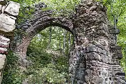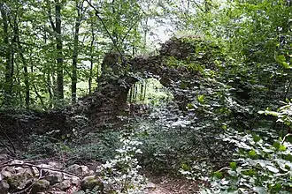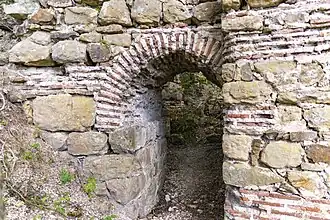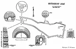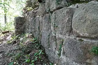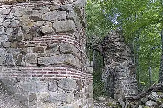 There were many buildings in the north-western part of the fortress with some walls preserved up to 1–2 m in height. Their entrances and some of the conical loopholes are clearly visible. It is possible that these solid buildings served as dwellings for the guards at the main entrance. Towards the middle of the fortress in the natural rocks there is a small water tank, perhaps natural or artificially cut. The real tank from which the fortress was supplied with water is located in its south part. This is an artificially carved pool in the rocks, surrounded above by walls. It is possible that it was covered, as it can be deduced from the side walls. Between the two reservoirs there is a foundation of a ruined building, with approximate dimensions of 9 by 6 m, oriented exactly east - west. It is possible that this was a church-chapel, but to confirm this assumption excavations are needed. Outside the fortress there were not found any other buildings, except for a stone road, 4–5 m wide, which is partially preserved in its beginning.[2] There are still three well preserved entrances to the fortress.