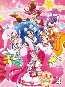 ![]() Cover of the final Blu-ray volume, featuring the six Cures. In clockwise order: Cure Chocolat, Cure Macaron, Cure Custard, Cure Whip, Cure Parfait and Cure Gelato in the center. | |