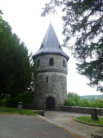 The Kirbergturm (Kirberg Tower), also known as the Römerturm (Roman Tower), is a stone watchtower that is a listed building.[1] It is located in the historic market town of Weilmünster in Hesse. The tower, which is almost 20 meters high, is located in the town center on the Kirberg hill (formerly known as Römerberg). It is one of Weilmünster's main attractions and provides a view of the town from above.[2]