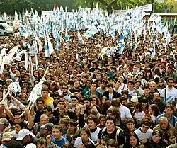 Initially, Kirchnerism has shown itself to be concerned with the defense of human rights, particularly in prosecuting those who committed human rights violations during the Dirty War and were later made immune from prosecution by the governments of Carlos Menem (1989–1999). The willingness of the Kirchner government to revoke these immunities has led many Argentine pressure groups, such as the Madres de Plaza de Mayo and Abuelas de Plaza de Mayo, to take an actively Kirchnerist position.[24] This has led to many controversies and to allegations that the Kirchners were never fully committed to human rights, especially during the period of the last military dictatorship, and that it was only when Kirchner became President and began to make alliances with the left-wing parties in Congress and with the Madres de Plaza de Mayo that he started to campaign about these rights in order to promote his own platform and gain popular favor. It is documented nevertheless that the Kirchners did push for trial against human rights violators during the dictatorship, although late in that period in 1983, when its end was already in sight.[25]