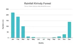 The Krindy Forest's climate is highly seasonal and tropical.[7] The cold and dry season generally takes place from March - April to November - December of each year. A season during which most trees shed their leaves.[8] The wet and hot season, also referred to as the rainy season[9] typically takes place from November - December to March - April. Some precipitations can be observed during this season which makes, the forest that makes access more difficult, hard to access. [10] The annual rainfall is concentrated throughout the brief rainy season with an average of approximately 800mm of rainfall every year in the region. Temperatures range yearly between 19 °C and 40 °C((104 °F)) with an annual mean of 25 °C.[7]