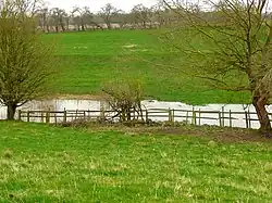 The site is on the south-west edge of the village of Kirk Deighton which lies north of Wetherby, North Yorkshire.[10] It consists of three adjacent fields grazed by sheep, hedgerows, a stone wall, a shallow pond and a little drainage pond. The size of the shallow pond varies seasonally. The site is unmarked and inaccessible to the public. There are no public facilities.[1] A licence is required for surveying in ponds which contain great crested newts.[11]