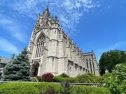 The architectural firm of George D. Mason completed the church based on preliminary designs by Wirt Rowland.[2] Rowland, who worked for Mason at the beginning of his career, died in 1946 during the design process. Services were held in the Undercroft beginning in 1952 and continued during the construction of the church until a disastrous fire destroyed most of the roof. The Church held its first services in the sanctuary on November 23, 1958. Kirk in the Hills is modeled after Scotland's Melrose Abbey. Set on 40 acres (160,000 m2) of beautifully landscaped lakeside grounds, Kirk in the Hills constitutes a fine example of Gothic architecture in the United States. Kirk is the Scottish word for Church.