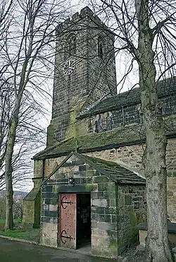 Kirkburton Church is dedicated to All Hallows. It was built in 1190, and is a Grade I listed building. Most of the structure is 13th century although parts have been rebuilt. The tower was added in the 15th century. Inside the church is a late-medieval nave ceiling, large wooden pulpit, stone font and Elizabethan and Jacobean pews. A small window in the chancel may have opened from the cell of a hermit. A restored 10th-century stone crucifix can be found inside, supporting the belief that another church or Christian settlement may have existed on this site. The church has undergone extensive restoration. The churchyard has also undergone landscaping and is a designated wildlife sanctuary.[7]