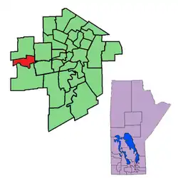Kirkfield Park is a provincial electoral division in the Canadian province of Manitoba. It was created by redistribution in 1979, and has formally existed since the provincial election of 1981.[1] The riding is located in the westernmost tip of the City of Winnipeg. It contains the neighbourhoods of Glendale, Westwood, Kirkfield Park, Woodhaven, Birchwood, Booth, Silver Heights and part of Assiniboia Downs