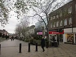 The most notable building on the street is Wakefield Cathedral.[6] Three other listed buildings lie on its south-west side: 11 and 13 Kirkgate, dating from about 1800;[7] 17 Kirkgate, from the mid-19th century;[8] and the late-18th century 19 and 21 Kirkgate.[9] Also on this side of the street is The Ridings Centre.[10] The West Yorkshire History Centre lies on its north-east side.[11]
