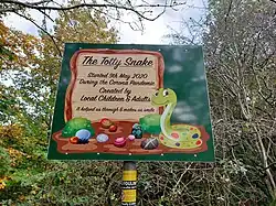 In May 2020, the Totty Snake community project was started along Kirklees Trail. It is made of a chain of pebbles painted by local children and adults which have been cemented into the side of the path, many of which were tributes to the work of the NHS during the COVID-19 Pandemic.