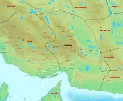 The province was originally part of the Parthian Empire, but was in the early 3rd-century conquered by the first Sasanian king Ardashir I (r. 224–242). According to the medieval Iranian historian al-Tabari, Ardashir I overthrew a local king in Kirman named Balash, who was either a member of the Arsacid royal family or the seven Parthian clans.[2] Right after having the province conquered, he found the town of Veh-Ardashir close to the Dasht-e Loot.[3] The town was a small but heavily protected town encircled by gardens and watered by many qanats, wells, and cisterns. Ardashir I also founded Narmashir, a caravan town which was constructed close to a little river near the ancient town of Bam.[4] The capital of the province at this time is unknown—the Greek writer Ptolemy, who lived during the late Parthian era, mentions an Alexandria and Kármana mētrópolis as the towns of the province, whilst Ammianus Marcellinus mentions a “Carmana mother of all [the province’s cities]”, but they give no additional information about the province.[2] One of Ardashir I's sons, also named Ardashir, was appointed as the governor of Kirman and given the title of Kirmanshah, which he would continue to rule during the reign of Ardashir's successor, Shapur I (r. 240–270).[2] According to a legend, the town of Mahan was also a Sasanian foundation, being founded by another Sasanian governor of Kirman, Adhar Mahan.[2]