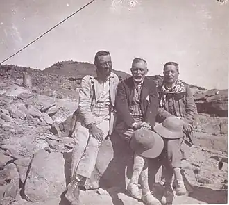 In later years, Lake became increasingly involved in archaeological expeditions. He had remarkable abilities as an organiser and an uncanny skill in finding the necessary money to fund his various undertakings. In the spring of 1927, with Robert P. Blake, he travelled to Saint Catherine's Monastery in Egypt to study biblical manuscripts. While passing through Cairo they met the Egyptologist Alan H. Gardiner who suggested that on their return they might stop by Serabit el-Khadim, which was in the neighbourhood of the monastery, and attempt to locate a number of previously noticed inscriptions in a Proto-Sinaitic script. As Lake remarked in his account of the adventure: "'in the neighborhood' is a relative matter, for, stated in terms of time instead of space, the monastery was about as far from Serabit as New York is from San Francisco." After a week's journey on camels they were able to locate the site and the inscriptions, as well as identify two additional inscriptions not previously known. "It is a pity that we could not identify the fragments more accurately," Lake noted, "but the temperature in the shade was over 115° Fahr., and the fragments were in the sun and almost too hot to touch" (HTR 21 [1928]: 3–4, 5). Lake would return to further investigate the site, as well as the adjacent temple of Hathor in 1930 on an expedition led by him and Blake, this time accompanied by Silva (his future second wife), at the time a Guggenheim fellow, who would handle the photography. In the results of the expedition that were published in 1932, Lake described the camp: "It was not exactly luxurious, and on two days when it rained it was extremely uncomfortable, as we had to spend the whole time in the cave, in which it was impossible to stand upright except in a few spots. The cooking was shared by Professor Blake and Mrs. [Silva] New, and consisted chiefly of rice, with canned meat dissolved in tomato-sauce and curry-powder" (HTR 25 [1932]: 98–99). A final trip was made in 1935; unfortunately, this time Lake was injured during the trip. He received internal injuries when bumped by a camel, but continued the journey, and was carried by litter to the top of the mountain. After supervising the start of the excavation, his condition worsened and he was rushed to Jerusalem with his wife to receive medical attention.[21] In 1929, Lake approached John Winter Crowfoot of the British School of Archaeology in Jerusalem (BSAJ) about a joint excavation with some other institutions of Samaria, to complete the earlier work of Harvard's George A. Reisner. The new dig began in 1931 and Lake was there for four seasons (1931–34), accompanied again by Silva and Blake. The joint team also included Eleazar Sukenik from Hebrew University and Kathleen Kenyon from the BSAJ. The excavation would yield many important results. As for accommodations in the camp, Kenyon reports that "although they had a hotel-trained Egyptian cook and Palestinian servants to do the washing, the expedition staff lived in tents, sleeping on camp beds" and "the social life of the dig consisted of having cocktails at the end of the day, playing bridge after dinner, and in 1933, listening to jazz records."[22] In 1938–39, Lake along with Silva and Robert P. Casey from Brown University were allowed to conduct a small excavation of Van Fortress in Turkish Armenia. For 15 years he had been seeking permission from the Turkish government to make the expedition. He told the press that until 1937, "the savage tribes of Turkish Armenia, the Kurds, have not been sufficiently pacified for the government to recommend the trip."[19] Details of the expedition were published in 1939.