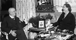 Flagstad also feuded with the Met's general manager, Edward Johnson, after conductor Artur Bodanzky's death, when she asked to be conducted for a few performances by her accompanist, Edwin McArthur, rather than by the Met's new conductor Erich Leinsdorf. Flagstad had wanted this for McArthur, whom she had taken under her wing. Johnson refused and would not hear of it any further. Flagstad did get her way, though; she went over Johnson's head and discussed the matter with the Met's board of directors, particularly David Sarnoff, RCA and NBC founder and chairman. It was Sarnoff who made the arrangements for McArthur to begin conducting Met productions on a limited basis.[5] Her relationship with Johnson improved, however; just before Flagstad left the Met in 1941, on the night of her 100th performance of Isolde, she received 100 roses, courtesy of Melchior and Johnson.
