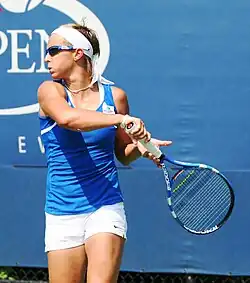 In July, she played her first semifinal in 2015 at İstanbul Cup, beating amongst others Francesca Schiavone and Alizé Cornet.[60] The following week, she reached quarterfinal of International-level tournament at the Baku Cup. Thanks to these two good results, she made it back into the top 100.[61] She proceeded to play the final of the $100k Vancouver Open, where she lost to Johanna Konta.[62] At the US Open, she was beaten in the first round by Varvara Lepchenko. In doubles, she played alongside Laura Robson. They reached the second round, where they were beaten by fifth seeds Caroline Garcia and Katarina Srebotnik. After the US Open, Flipkens was diagnosed with a cyst on the wrist, which made her unable to play, resulting in her dropping out of the top 100 again. She made her comeback at the Linz Open. This comeback was successful for Flipkens, reaching the semifinal, where she beat amongst others the former No. 1, Caroline Wozniacki, before eventually falling to Anastasia Pavlyuchenkova.[63] She officially finished the year 2015 as No. 93 in the world.