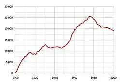 During World War I, iron ore production dropped to the lowest level in LKAB's history, and when exports increased again, a successful three-month strike in 1920 led to a 20% increase in salaries for the miners. Production dropped to a minimum in 1922 and a three-day work week was introduced, but during the fabulous twenties, it increased to a record nine million tonnes in 1927.[12]