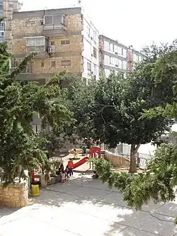 Kiryat Itri was planned for 250 families.[1][6] Three high-rise apartment buildings were erected on the south side of the street, and five low-rise apartment buildings on the north side. The flats were small by American standards.[5] A supermarket and postal agency[7] occupy the ground floor of 14 Sorotzkin, the westernmost building. The main street, Rechov Sorotzkin, is named after Rabbi Zalman Sorotzkin.[8]