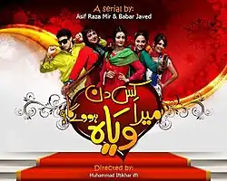 Kis Din mera Viyah Howay Ga (meaning, "When will I get married?") is a Pakistani sitcom series first aired on Geo TV in August 2011. The series was first directed by Muhammad Iftikhar Iffi and starred Faisal Qureshi, Aijaz Aslam, Jana Malik, and Sangeeta.[1] The plot revolves around the Chaudhary family who live in a mansion together in a small village near Lahore, Pakistan. Much of the humor centers around the character Sheeda who disguises himself as a girl named Sheedo to hide from his former gang members, and to protect himself from being arrested. Kis Din Mera Viyah Howay Ga went off the air 15 September 2011, and returned for a second season in late July 2012. The second season ended on 23 August 2012, after a decline in viewership, but it was renewed and the third season started on 11 July 2013.