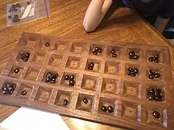 The board used to play Kisolo varies in size depending on common practice and region on the African continent . A board with 32 pits; 4x8 (i.e., 4 rows of 8 pits) is played in the northwestern region of Democratic Republic of Congo. The board in other regions may be is 4x7, i.e., 4 rows of 7 pits each, although there are also Kisolo boards that have 6 pits per row. At game setup, most normally 2 seeds are placed in each pit but some regions start with 3 seeds. Traditionally, seeds from the ngola tree (Pictantus makombo) or the menga tree (Canarium schweinfurtii) are used, or small stones.