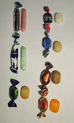 Kiss-Kiss is a brand of candy launched by the Finnish company Fazer in 1897.[1] It is Fazer's third oldest brand of candy.[2] Kiss-Kiss is currently sold at Christmas time in a separate package and all year round in the Fazerin Parhain (Fazer's Best) candy mix bag. It is oblong, pink in colour, with a soft and crunchy shell containing sticky toffee.[2]