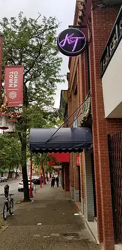 The exterior of Kissa Tanto is designed to be unobtrusive, blending into the neighborhood and creating a sense of discovery for patrons.[4][5][11] The red brick building, with its jade-green Chinese-style roof tile, was left in its original condition of slight disrepair.[13][17] A small purple neon sign reading "KT" and a royal-blue awning reading "Kissa Tanto" are the only outward indications that the restaurant is there.[5][18][19] A steep staircase leads up to the restaurant proper, which is hidden behind thick blue velvet curtains.[20]