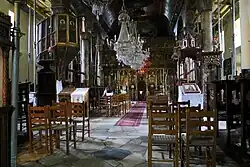 The church of Agia Marina, which dates back to the 17th century, is located in Kissos. The church was built in 1650 during the Turkish occupation of Greece.[2] The size of the church and the fact that it was built in the main square of the village suggest that the church was built with the permission of the Turks. The church is beautifully decorated inside with frescoes and wooden carved iconostases.