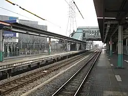 The station consists of two ground-level opposed side platforms serving two tracks, which form a passing loop on the single-track line. The tracks are connected by the elevated station building, which is built above and perpendicular to the tracks. The station is attended.