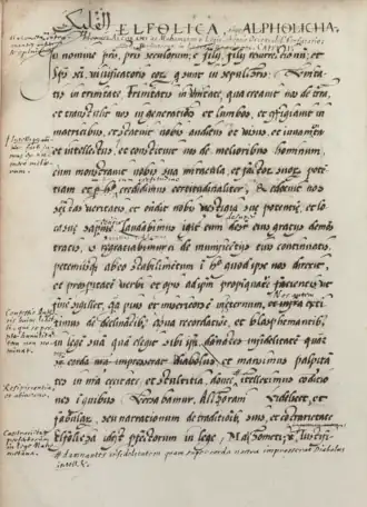 The full title chosen by the Latin translator, Liber denudationis siue ostensionis aut patefaciens, means "Book of Denuding or Exposing, or the Discloser".[7] It may be derived from the alternative title Hatk al-Maḥjūb sometimes given to the Kitāb, which means "Disclosure of the Veiled" or "Unveiling of the Veiled".[8] Ramon Llull refers to the work as the Liber Telif.[9] At some point in the 17th century, a gloss was added to the sole Latin manuscript giving it the title Contrarietas alfolica, meaning "the disagreement of the fuqahā", that is, the Islamic jurists.[10] This title may be a translation of the Arabic term ikhtilāf al-fuqahā. A corruption of ikhtilāf may explain Llull's word Telif. Alternatively, it may derive from the Arabic tālif al-fuqahā, "destroyer of the legists", a play on the established term with a stronger meaning.[11] Contrarietas alfolica was for a long time the title by which it was known to scholarship.[12] It comes from an expression in the first chapter (contrarietate elfolicha).[13]