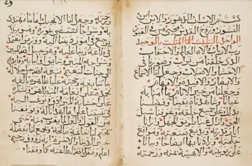 The Latin translation of the Kitāb survives in a single manuscript, now in Paris, Bibliothèque nationale de France, Latin 3394.[59] It was copied in Italy in the late 16th century in humanist cursive.[60] It was copied from an early manuscript, probably of the 13th century and itself copied in a Dominican milieu.[61] It has extensive annotations added by a 17th-century hand.[62] In the early 14th century, Riccoldo da Monte di Croce quoted from and paraphrased it extensively in his Contra legem Sarracenorum, which is found in many manuscripts.[63] Riccoldo's autograph manuscript survives.[64]