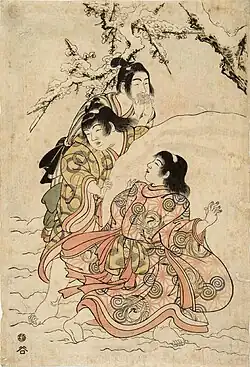 Kitao Shigemasa (北尾 重政; 1739 – 8 March 1820) was a Japanese ukiyo-e artist from Edo. He was one of the leading printmakers of his day, but his works have been slightly obscure. He is noted for images of beautiful women (bijinga). He was taught by Shigenaga and has been referred to as "a chameleon" who adapted to changing styles. He was less active after the rise of Torii Kiyonaga and produced relatively few works considering the length of his career.[1] He is also noted for his haikai (poetry) and shodō (Japanese calligraphy). In his later years he used the studio name Kosuisai.[2]