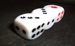 Kitsune Bakuchi (狐博奕) is a dice game from Japan in which a player rolls three dice; if the roll results in a triple, i.e., each dice shows the same number, they win four times the amount wagered. The term literally means "fox gambling."[1]: 167
