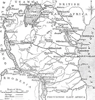 The Anglo-German Agreement of 19 May 1909 defined the boundary between the northwest of German East Africa and Uganda. It claimed to be based on agreements in 1884 and 1890 in which Germany ceded part of Mfumbiro region to the British in return for Britain promising to make no further claims.[9] The Germans agreed with the British that the whole Kilimanjaro massif would be in German East Africa, while in exchange the British would receive the Ufumbiro.[4] According to the Germans this did not refer to the Mfumbiro Mountains but to the plain of Ufumbiro to the north of Lake Kivu.[1] Von Schoen of Belgium wrote to Baron Greindl on 30 July 1909 protesting against this agreement, which dividing Belgian territory between Britain and Germany.[9]