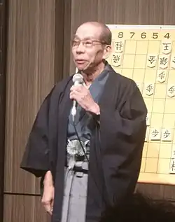 - ^ "Kiriyama Kudan Nanajūyonsai Geneki Sainenchō Kishi ga Intai Taikyoku ni Haitai, Gojūrokunen no Geneki ni Maku Deshi・ Toyoshima Kudan kara Hanataba" 桐山九段 74歳現役最年長棋士が引退対局に敗退, 56年の現役に幕 弟子・豊島九段から花束 [Curtain drops on the 56-year career of shogi oldest active professional as Kiriyama 9-dan retires at age 74 after losing last game; Kiriyama received flower bouquet from protegee Toyoshima 9-dan afterwards.]. Sports Nippon (in Japanese). April 27, 2022. Retrieved December 8, 2022.