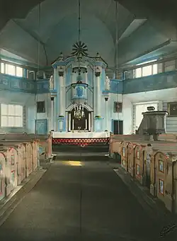 The log building was torn down in 1789 and a new church was built on the same site from 1789-1790. The new building was a timber-framed church was built in the shape of an elongated octagon. The new building was consecrated in 1790.[4][5]