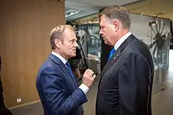 The collaboration with socialist Prime Minister Victor Ponta was praised by both sides at the start of the mandate, but deteriorated thereafter once with foreign visits of the Head of the Executive, without informing the President, but especially with the criminal prosecution of Victor Ponta for 22 alleged corruption charges, prompting Iohannis to demand his resignation from the head of the Government.[59] Relations with Parliament went similarly. Iohannis criticised the Parliament for defending MPs by rejecting the requests of the National Anticorruption Directorate for lifting their immunity, as in the case of PSD senator Dan Șova or Prime Minister Victor Ponta.[60] Regarding the judicial system, Iohannis pleads for a sustained fight against corruption. Likewise, Iohannis expressed dissatisfaction with attempted amendments to the Penal Code.[61] In the context of foreign policy, Iohannis and Andrzej Duda, the President of Poland, created Bucharest Nine during a meeting between both in Bucharest on 4 November 2015.[62] The Russian annexation of Ukrainian Crimea and the country's intervention in the east of Ukraine are the main reason for the creation of the organisation. It has nine members, Bulgaria, the Czech Republic, Estonia, Hungary, Latvia, Lithuania, Poland, Romania and Slovakia.[63][64]