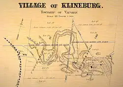 The community began in 1848 when John Nicholas Klein (1825–1854), a German-Canadian settler built a flour mill along the Humber River's west branch in the valley in 1847. A settlement soon resulted at the bottom of the hill, originally named "Kleinsburg" (after John Klein, and "berg" being German for hilly country or hill). The village at the top of the hill was known as "Mount Vernon", but by 1890 both became known as Kleinburg (sometimes shown as Klineburg). The Howland family later took over the flour mill, and added a sawmill and store.[4] Over time, more and more businesses sprung up to support the mills, notably the Howland's flour mill, which was the largest between Barrie and Toronto and attracted farmers for miles.[5] A community developed in town, with hotels, merchant shops, schools and churches.