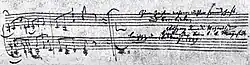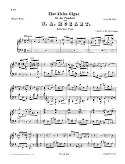 Kleine Gigue in G major, K. 574, is a composition for solo piano by Wolfgang Amadeus Mozart during his stay in Leipzig. It is dated 16 May 1789, the day before he left Leipzig. It was directly written into the notebook of Leipzig court organist Carl Immanuel Engel. It is often cited as a tribute by Mozart to J. S. Bach, although many scholars have likened it to Handel's Gigue from the Suite No. 8 in F minor, HWV 433.[1] In fact, the subject of the gigue bears a marked similarity to the subject of J. S. Bach's B minor fugue no. 24 from book 1 of The Well-Tempered Clavier. Mozart has changed the tempo from Largo to Allegro deciso and the time signature from common time to 6