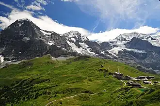 Kleine Scheidegg is among the most celebrated mountain passes in the Swiss Alps because of its position just north of the point where the Bernese Alps makes a salient angle, whose apex is the Eiger. From there, a series of high peaks rise in line towards the northeast, on the left side of the trail that follows a direct route from Meiringen, southwest across the Grosse Scheidegg, to Kleine Scheidegg. On the south side of the apex at the Eiger, the still higher summits of the Mönch, Jungfrau, Gletscherhorn, and Mittaghorn follow in succession from north to south.[3]