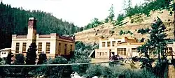 Plans for a health spa gave way to a large bottling plant to supply Safeway with bottled water. However, although the bottled water was well liked it wasn't possible to keep the water clear and the bottles would soon go flat. After the owner, Mr. Langdon of Walla Walla, Washington, killed himself, in 1931 Raymond Newbern was sent by the Baker-Boyer Bank of Walla Walla to investigate the property to determine if it could be developed. Mr. Newbern concluded there was no future in mineral water and decided that there was a future in dry ice. Tests showed the CO2 was pure. Newbern took a 99-year lease on the property and formed the Gas-Ice Corporation. After 4 years and $200,000 of investment in plant equipment the company generated a small profit in 1936. Demand for dry ice grew, prompting more wells to be drilled and expansion of the facility. It eventually reached maximum production of 18 tons per day, limited by the available gas flow in the area.[3] In 1957 Newbern expanded capacity in Kennewick, Washington where CO2 was a by-product of ammonia fertilizer production. In 1968 he sold his holdings and the Klickitat plant was closed. In 1972 the property was sold to the Washington State Department of Game. The main building of the dry ice plant complex has been retained as a sanctuary of swifts, which nest in the chimney.[4]